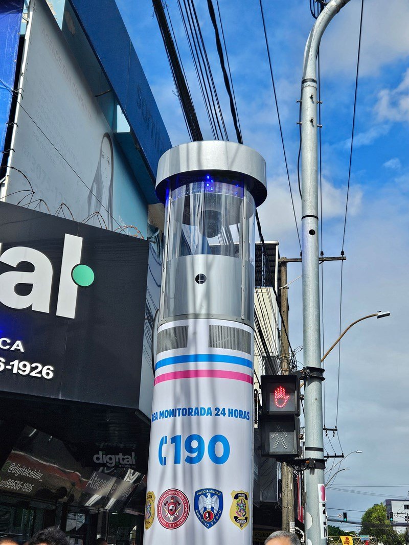 O novo equipamento é parte do parque tecnológico de segurança pública do Espírito Santo, que já está transformando a forma de proteger os capixabas. Com quatro metros de altura, os Totens são verdadeiras torres inteligentes: equipados com câmeras de 360°, reconhecimento facial e de placas, comunicação direta com o Ciodes 190, giroflex e sistema de áudio que emite mensagens automáticas. É como ter uma base policial tecnológica funcionando 24 horas por dia!